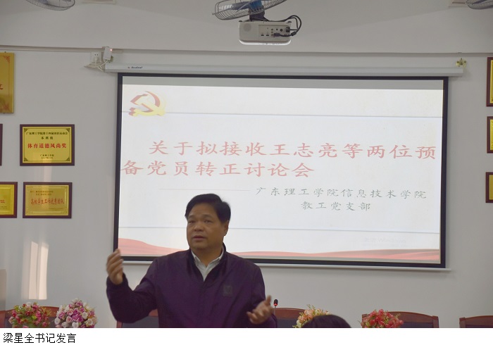 梁玉英老师介绍本次会议流程,会议议题是讨论拟接收黄锦波同志和王志亮同志为中共预备党员。梁书记根据黄锦波、王志亮同志在思想政治、工作能力、业务学习等方面的表现给予了充分的肯定,并要求他们在今后要继续积极地接受党的教育,从组织上、思想上、行动上真正向党靠拢,不断提高自己的教学业务水平,掌握岗位本领,在工作中起到模范带头作用,全面提升自己的政治思想觉悟、党性原则和理论水平。