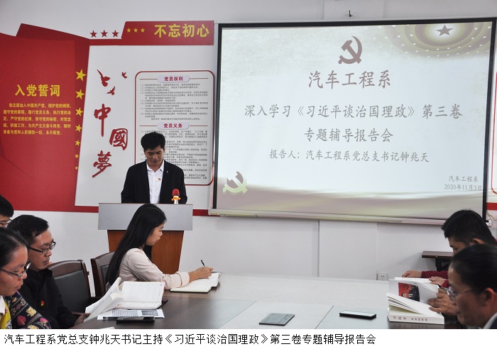 本网讯(汽车工程系)为深入学习《习近平谈治国理政》第三卷,进一步统一认识、明确方向,坚持党中央权威和统一领导, 11月3日,汽车工程系党总支在7303会议室召开深入学习《习近平谈治国理政》第三卷专题辅导报告会。本次专题辅导报告会由汽车工程系党总支钟兆天书记主持,全体教工党员参加。