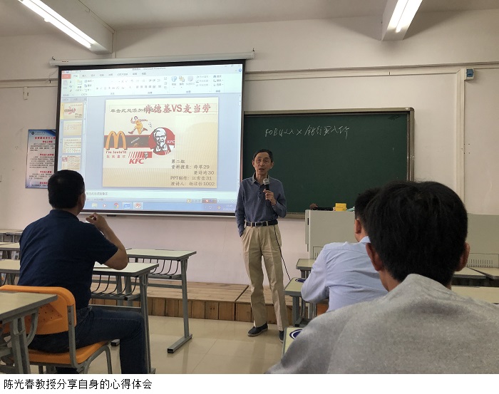 贺教授谈到,学习完重庆主办的“高校教师思政和课程思政研修班”后感受颇深。他谈到,思政教育与专业教育之间存在一定的联系,渗透思政讲专业,结合专业讲思政,双向融合,协同育人,是进一步提高课程建设质量和教学水平的基础。贺教授指出,课程思政建设是一项系统工程,建议经济管理学院教师以本次研修班为契机,充分发挥教师的主体作用,深度挖掘课程中的思政教育元素,提升课程的广度、深度和温度。