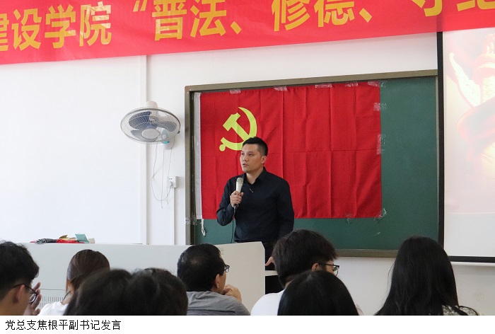 本网讯(建设学院学生党支部)为落实党的十九大精神,坚持“依法治校、以德治校”。 10月27日,建设学院学生党支部于6206教室召开“普法、修德、守纪、创优良学风”演讲比赛动员大会,建设学院党总支周景报书记、焦根平副书记、学生党支部张毓恒书记、吴良超老师、全体辅导员、学生党支部全体成员及各班代表。