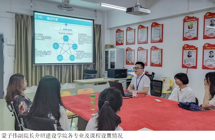 蒙子伟副院长介绍了建设学院各专业及课程设置情况,并深入讲解各专业建设目标与内容、建设方案、进度安排及预期成果,蒙副院长还带领在座教师了解“3+1”培养计划,专业教师结构等方面内容。