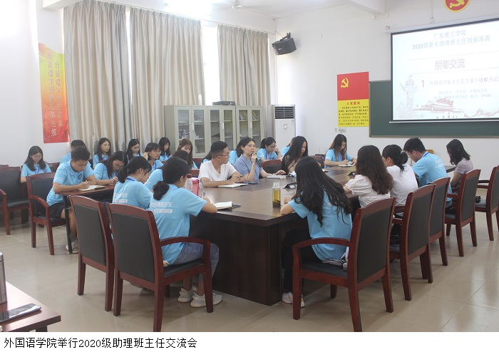 本网讯(外国语学院)为引导新生助班明确工作职责,增强助班的责任感和使命感,确保新生入学工作有序、高效、顺利开展,外国语学院于9月13日下午举行题为“朋辈交流”的新生助理班主任交流会。本次会议由2020级外国语学院助班团队负责人吴宝君主持,出席会议的有外国语学院学生党支部于晓嵘书记,辅导员宋闪闪老师、辅导员尚旭杰老师和全体2020级新生助理班主任。