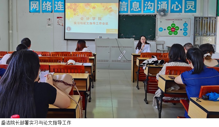 盛洁院长全面部署了新学期的本科企业综合实习与论文指导工作。盛院长指出,目前财务管理专业与会计学专业是会计学院的两个本科专业,都实施了“3+1”人才培养模式。企业综合实习与论文是本科专业建设中非常重要的组成部分,也是本科评估中重点的评估环节。她强调,每一位教师都要高度重视学生的实习指导与论文指导工作,要以高度的职业责任感,切实履行好指导职责。