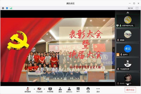 本网讯(经济管理学院)7月15日晚上,经济管理学院学生党支部负责人换届暨表彰大会通过线上会议方式顺利召开。经管学院党总支吴楚升副书记、经管学生党支部书记赵雪娇老师、18级、19级学生工作助理参会。