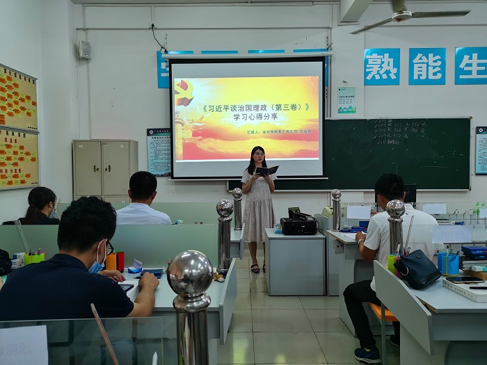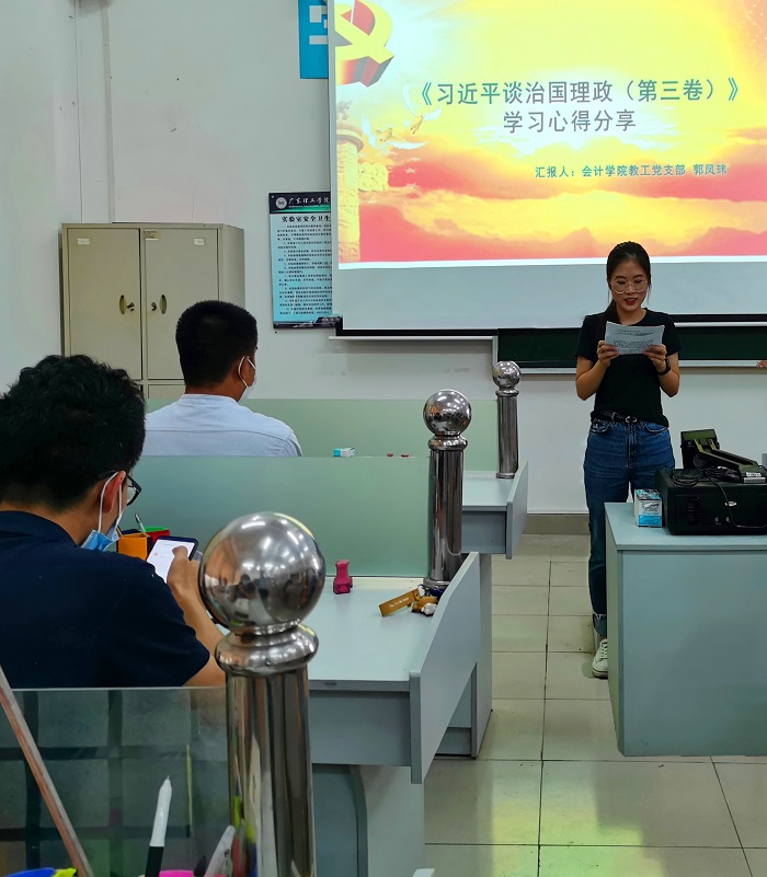 教工党员岑逸翘老师和郭凤玮老师依次分享了学习《习近平谈治国理政》第三卷的心得。岑逸翘老师着重从课程思政的角度,阐述高校教师如何在专业育人的过程中融入思政元素,不断提升教书育人的水平。郭凤玮老师主要从学生的视角,分析了学生眼中所见证的小康社会的图景,认为应当关注学生需求,引领他们参与社会实践。