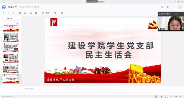 本网讯(建设学院学生党支部)7月8日,建设学院学生党支部召开线上党员民主生活会。建设学院党总支周景报书记、焦根平副书记、宣传委员吴良超老师以及全体党员同学参加会议,建设学院学生党支部张毓恒书记主持。