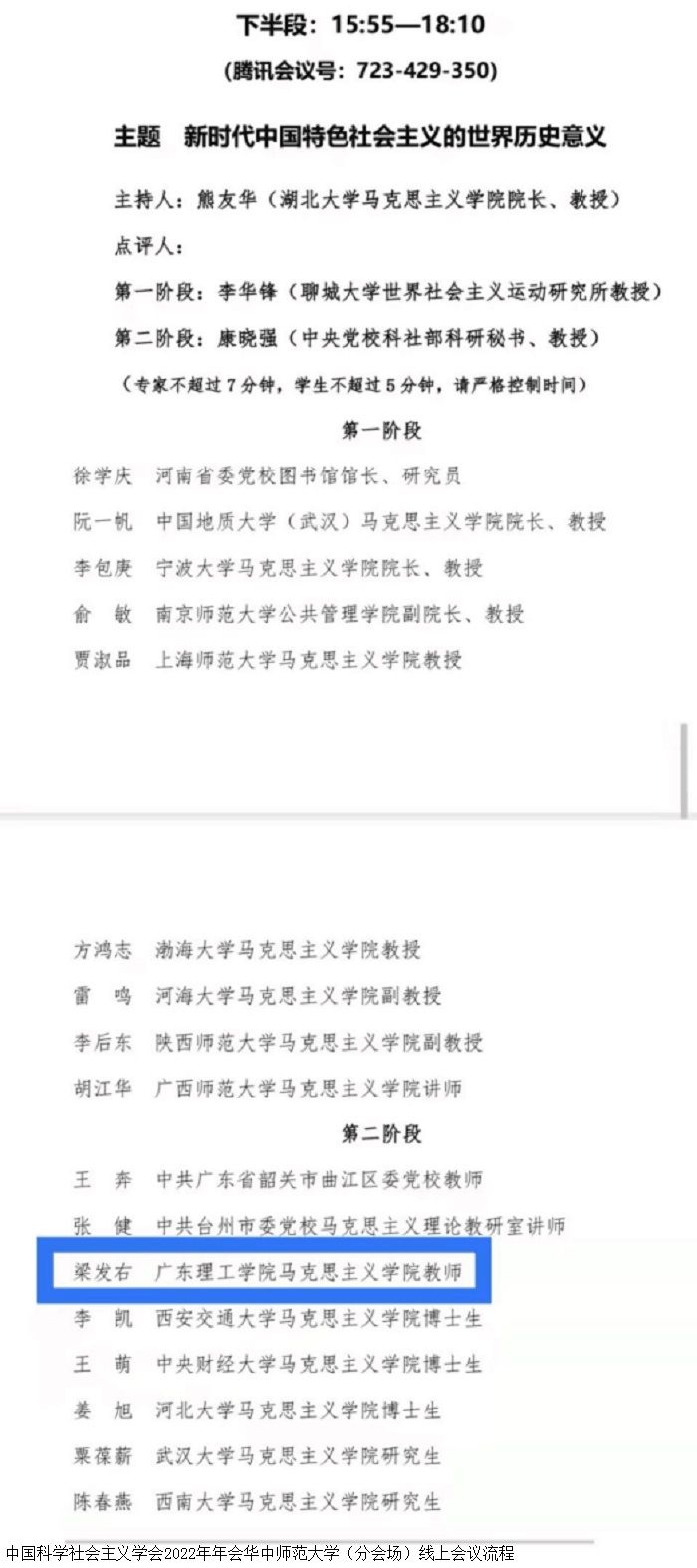 本网讯(马克思主义学院)11月5日,“深入学习贯彻党的二十大精神”学术研讨会暨中国科学社会主义学会2022年年会分别在中央党校(主会场)和华中师范大学(分会场)隆重召开,鸭脖官网马克思主义学院梁发右老师受邀参会并以线上形式在华中师范大学(分会场)作了“中国式现代化的伦理意蕴”的主题发言,获得了与会专家的肯定与赞扬。本次受邀充分展示了鸭脖官网马克思主义学院教师良好的科研素养和精神风貌,是鸭脖官网教师学习贯彻党的二十大精神的具体体现,对于进一步提升鸭脖官网的学术影响力具有积极意义。