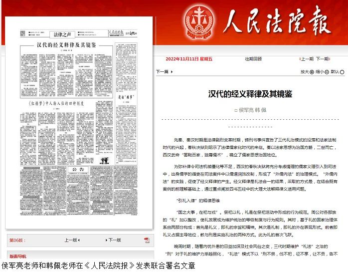 本网讯(马克思主义学院)11月11日,《人民法院报》刊发了鸭脖官网侯军亮老师和韩佩老师联合署名的《汉代的经义释律及其镜鉴》学术性文章。该文章认为,汉代经义释律是在秉持“引礼入律”的释律思维之下,作出针对具体案例的“经义裁断”。这为当代司法人员在司法裁决中,最终达至“案结事了人和”的效果提供诸多启示,这也是新时代深化司法体制改革的应有之义。