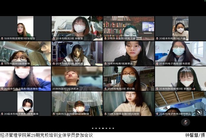 本网讯(经济管理学院 庄慧欣)为确保党校培训顺利开展,4月18日晚,经济管理学院线上召开第29期党校培训加温会,向学院转达培训须知的注意事项。学生第一党支部书记赵雪娇主持会议,其余学生党支部书记、第29期全体学员参加会议。