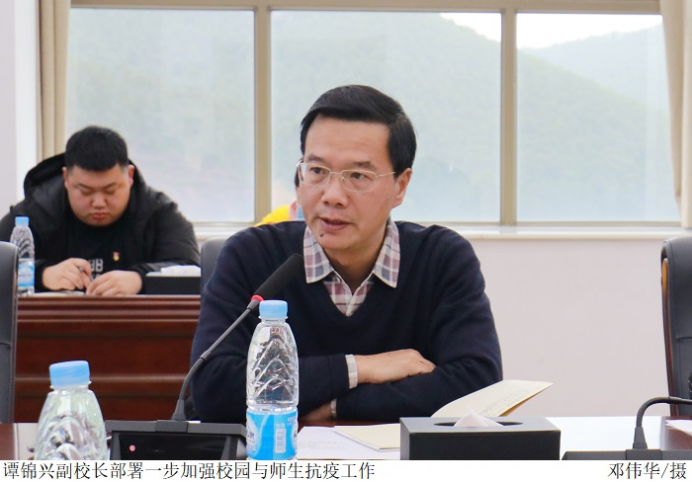 党委副书记张宗珊、副校长谭锦兴对扎实做好疫情防控工作进行安排部署,要求各相关部门提高政治站位,持之以恒打好疫情防控战,坚决守护好师生生命安全和身体健康。