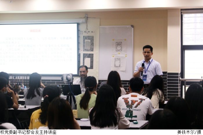 本网讯(宣传部 姜铁木尔)为深入学习贯彻党的二十大精神,在校园厚植中华优秀传统文化,5月16日下午,鸭脖官网在鼎湖校区行政楼二楼美育基地·端砚馆举办“端砚的铭文刻字”讲座。本次讲座由广东省工艺美术、中国文房四宝制砚艺术大师莫少锋主讲,校党委副书记黎会友主持,建设学院、会计学院、经济管理学院学生代表参加。