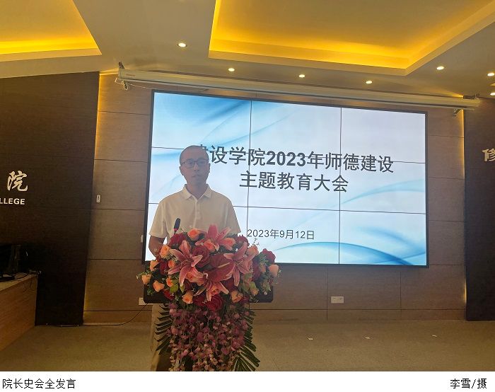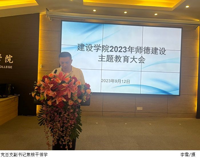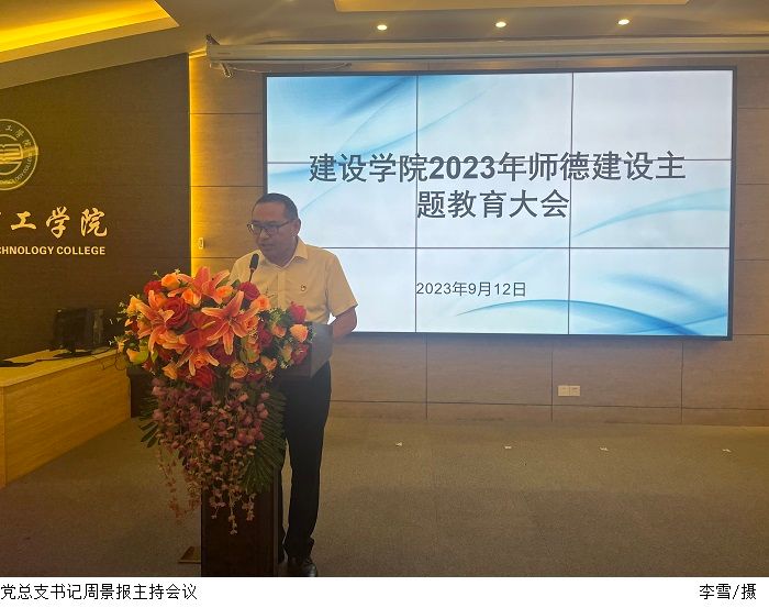 本网讯(建设学院 李雪)为了落实立德树人根本任务,进一步加强新时代师德师风建设,提升教师的职业道德素养,引导广大教师坚定理想信念、涵养高尚师德,9月12日下午,建设学院在行政楼学术报告厅召开2023年师德建设主题教育大会,本次会议由党总支书记周景报主持,院长史会全,副院长蒙子伟、韩智凡,副书记焦根平及全体教职工出席会议。