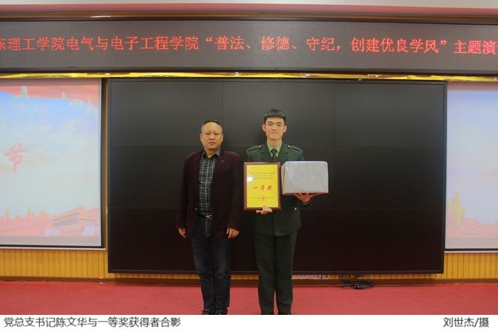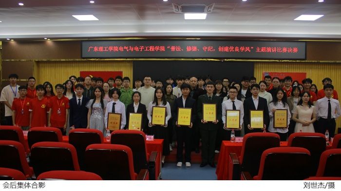 本网讯(电气与电子工程学院学生党建工作中心 柯棋哲)为加强法治教育,提高学生法治意识,道德水平和纪律观念,推动在全体学生中形成尊法守法学法用法的良好氛围,电气与电子工程学院11月14日在42栋101报告厅举行“普法、修德、守纪,创建优良学风”演讲比赛决赛,电气与电子工程学院党总支陈文华书记、陈强副书记,全体辅导员出席活动。