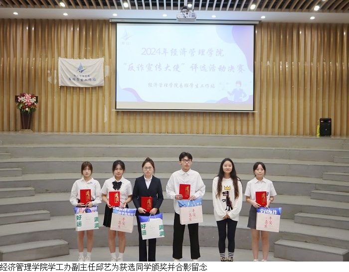 大赛期间,八位参评人依次上台进行讲述,评委老师依次对参评人进行反诈知识问答。随后,主持人对现场观众提问互动,大赛现场播放了《轻信苦果》《迷局》《猎物》三个反诈视频以及经管受骗学生的现身说法视频。最后,邱艺为五位获选同学颁奖并合影留念。