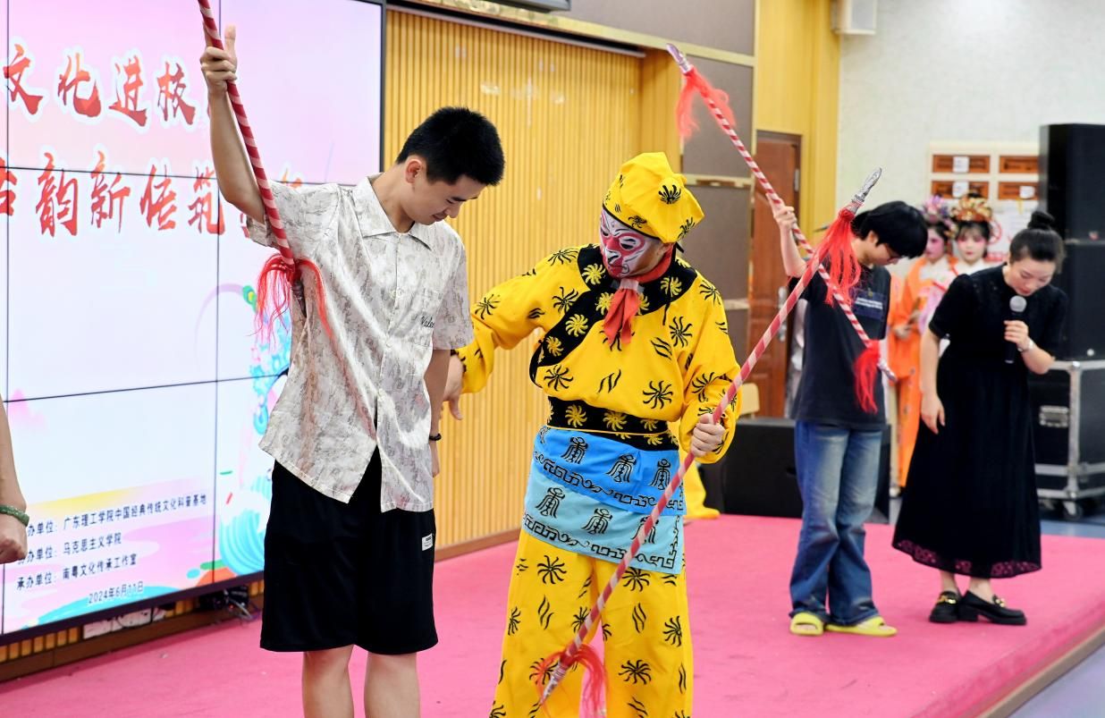 紧接着,粤剧表演团队献上了经典折子戏《李逵探母》和《帝女花》,演员们精湛的演技和深厚的艺术功底赢得了在场观众的阵阵掌声。此外,黄丽华和刘莹分别带来了二胡独奏和琵琶独奏,悠扬的音乐与粤剧表演相得益彰,为现场观众带来了沉浸式的艺术体验。杨占武更是以其精湛的技巧生动演绎了“美猴王”形象,并与现场学生进行了互动教学,让学生们亲身感受到了粤剧艺术的魅力。为了让更多学生参与到粤剧文化的传承中来,活动还设置了粤剧妆造和道具体验环节。学生们在戏剧工作人员的指导下,亲自尝试穿戴粤剧服饰、使用道具,深入体验了粤剧文化的独特魅力。