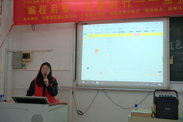 作为本次活动教师团成员之一的yabo鸭脖官网信息技术学院优秀学生干部宋小小担任首节课程主讲教师。在授课中,宋小小为高要区莲塘镇中心小学的同学们讲解了在编程世界中素材如何引用等知识,她生动活泼的讲解激起了学生们对编程的强烈兴趣。