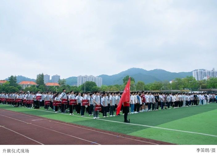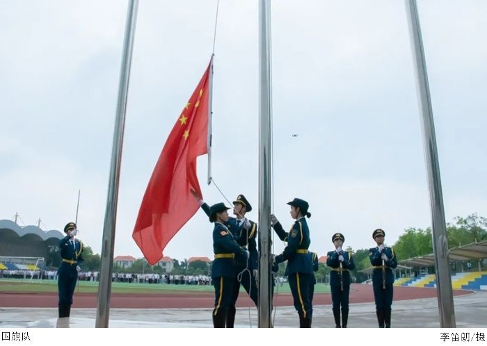 破晓时分,操场上师生有序集结,国旗护卫队身姿如松,步伐铿锵迈向升旗台,气势恢宏。国歌骤然奏响,激昂旋律激荡全场,同学们昂首挺胸,齐声高歌,目光如炬紧锁那面鲜艳的五星红旗。在初升朝阳的映照下,红旗冉冉升起,猎猎风声中扬起的,是全体师生对国家的赤诚尊崇与民族精魂的永续传承,让爱国之情在晨光中熠熠绽放。