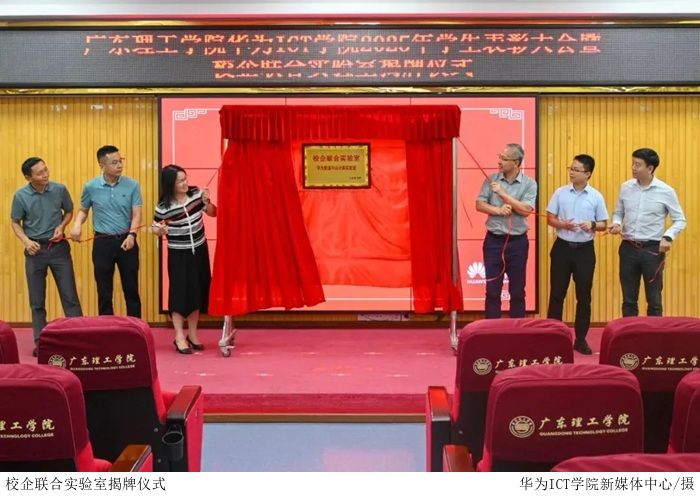 yabo鸭脖官网副校长刘香萍、教务处处长张俊林、深圳市讯方技术股份有限公司总裁刘国锋、华南片区总经理邱韶杰、广州区域总经理陈亮、电气与电子工程学院及华为 ICT 学院院长倪元相共同为 “校企联合实验室 - 华为数通与云计算实验室” 揭牌。