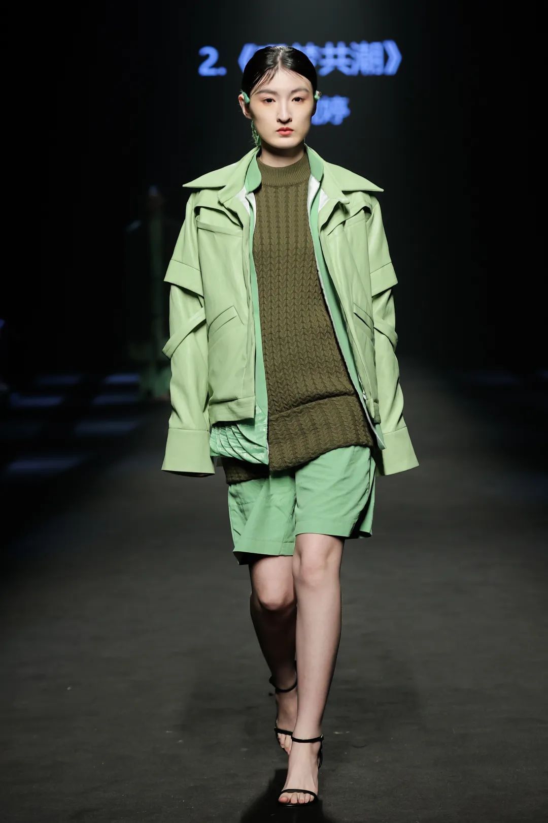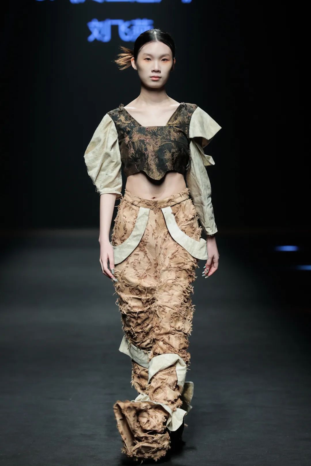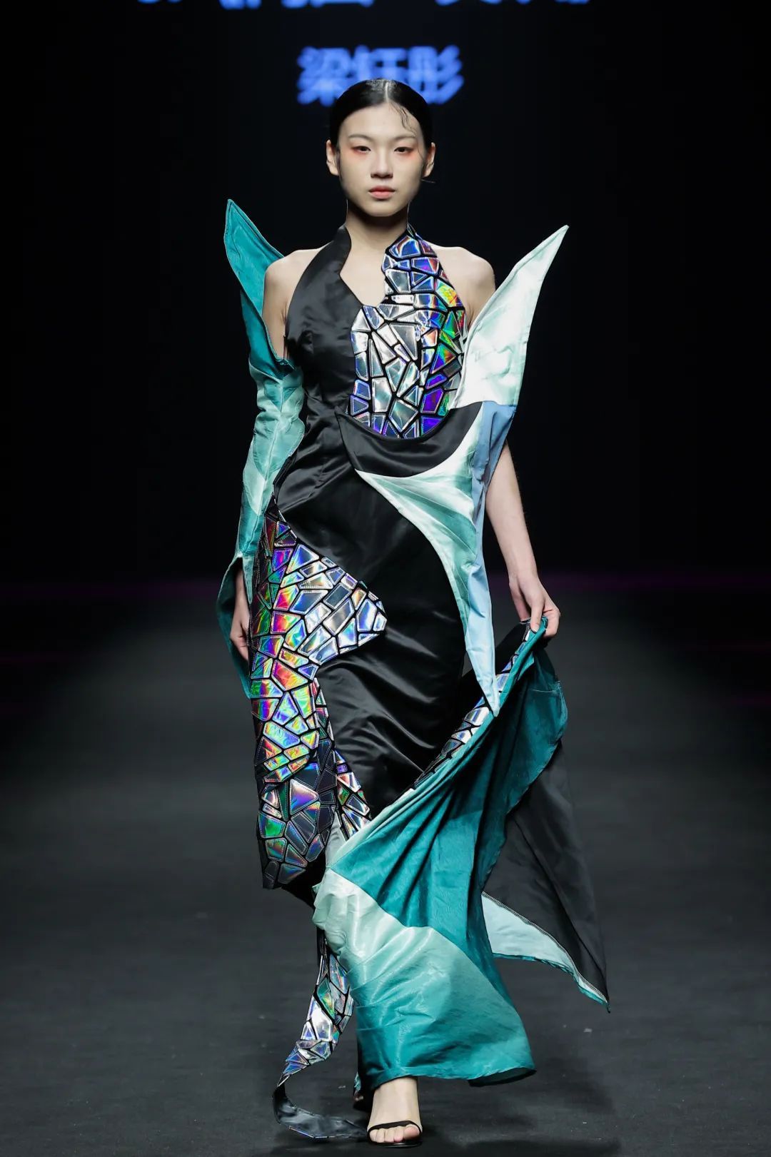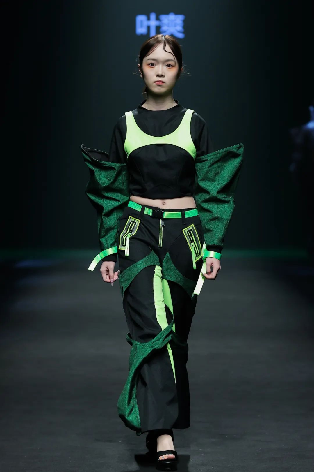 整场大秀分3个主题演绎:主题一《暗夜森灵》以赛博霓虹重塑空间拓扑,呈现未来衣橱的无限可能;主题二《数字涂鸦》以泼墨笔触勾勒立体数字,撞色拼接剪裁利落,街头潮感十足;主题三《国色新韵》则用古布与数字绣纹重构经典,在光影迷宫中展开一场跨越千年的对话。