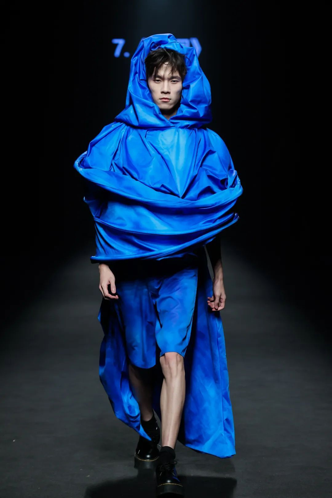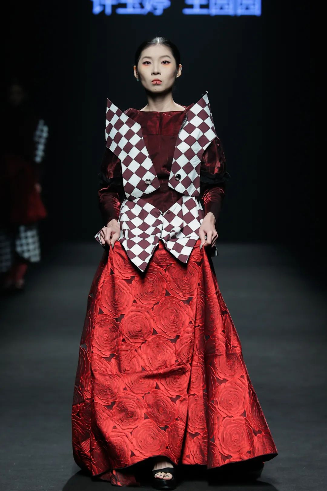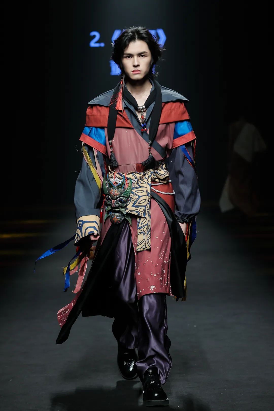 整场大秀分3个主题演绎:主题一《暗夜森灵》以赛博霓虹重塑空间拓扑,呈现未来衣橱的无限可能;主题二《数字涂鸦》以泼墨笔触勾勒立体数字,撞色拼接剪裁利落,街头潮感十足;主题三《国色新韵》则用古布与数字绣纹重构经典,在光影迷宫中展开一场跨越千年的对话。