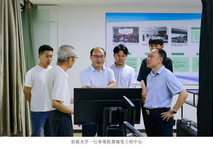 卢忠荣一行在学校领导陪同下,参观了学校机器视觉工程中心,实地考察了学校在信息技术、电气与电子工程、智能制造等领域的教学科研平台及成果。卢忠荣一行对学校在产教融合、技术创新方面的实践能力给予高度评价。
