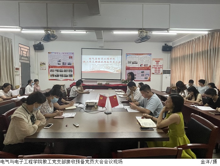 本网讯(电气与电子工程学院 叶运黎)5月31日下午,电气与电子工程学院教工党支部在7203会议室召开接受预备党员大会,全体支部党员参会。教工党支部书记黄美莲主持会议,党总支书记陈文华、副书记陈强以普通党员身份参加了本次会议。