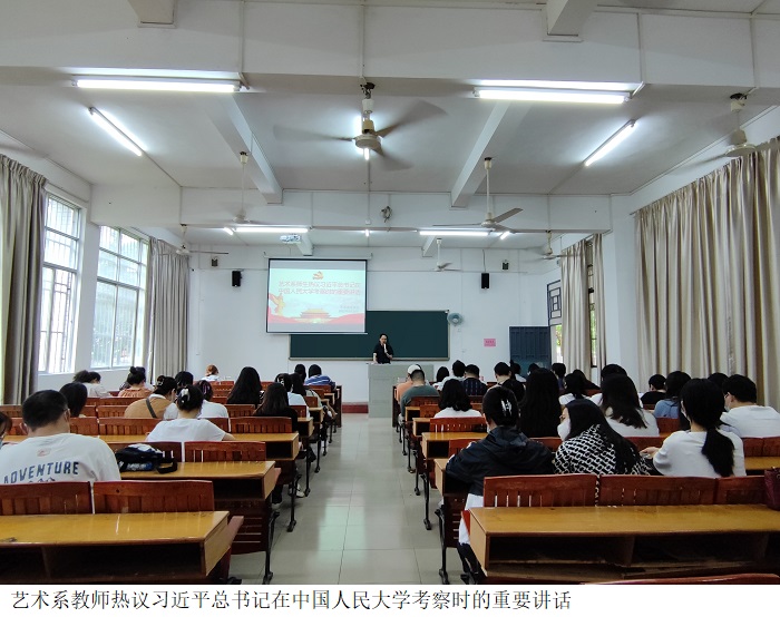 本网讯(艺术系 罗家栋)艺术系于5月10日下午,在6102学习了习近平总书记在中国人民大学考察时的重要讲话精神。党总支书记赵宁领学,艺术系全体老师共同参与。