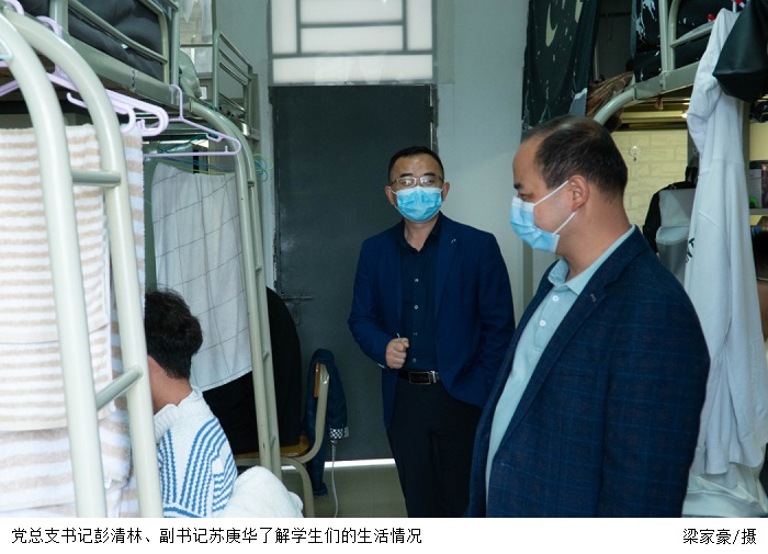 彭清林一行前往西区11栋,查看学生宿舍,并与同学们亲切交谈,详细了解他们生活、学习等情况。彭清林对同学们说,当前是疫情防控工作的关键时刻,线上学习对于师生来说都是一个挑战,同学们要听从各任课老师的线上教学安排,认真完成课程学习,另外还要自觉履行个人防护责任和措施,增强自我防范意识。