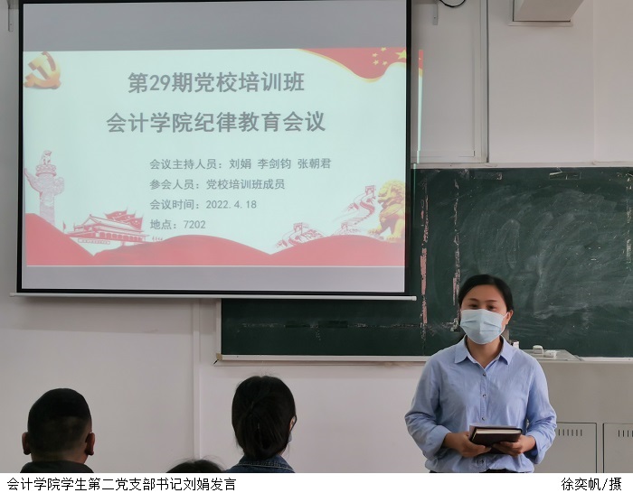本网讯(会计学院学生党支部先锋队 林黎芝)为加强党校培训班的纪律建设,优化校园纪律作风,在学校党委和会计学院党总支的统一部署下,4月18日中午,会计学院学生第一、第二党支部在7202课室召开党校培训班纪律教育会议。学生第二党支部书记刘娟、学生第一党支部组织委员李剑钧和宣传委员张朝君以及第29期党校培训班成员参会。