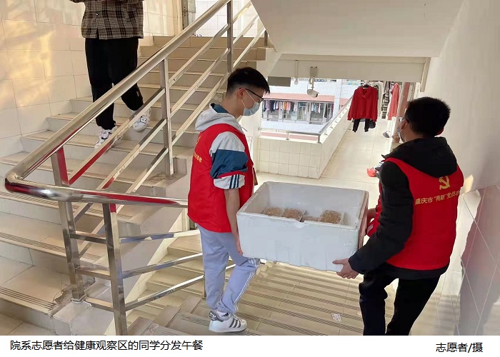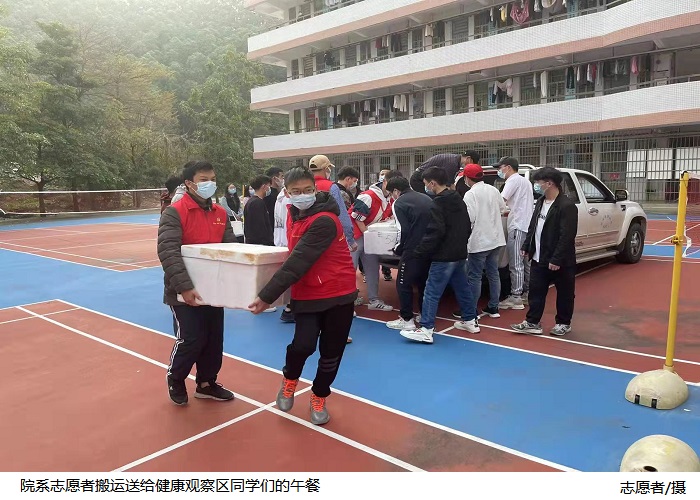 同时,学院积极组建学生志愿者服务队,在统一安排下,分赴各个岗位开展科学防疫知识科普、核酸采样现场秩序维护、健康观察区送餐等工作,院系党员干部、师生志愿者充分发挥先锋模范作用,勇于担当,勇往直前,奔赴在疫情防控工作的第一线。学院党总支、院系教师团队及各班级自发组织通过视频、信件等方式,向被确认为新冠肺炎密接者且正在隔离观察的1名同学以及留在健康观察区的同学们致以亲切的慰问,诚挚地表达了对他们的关心与支持。