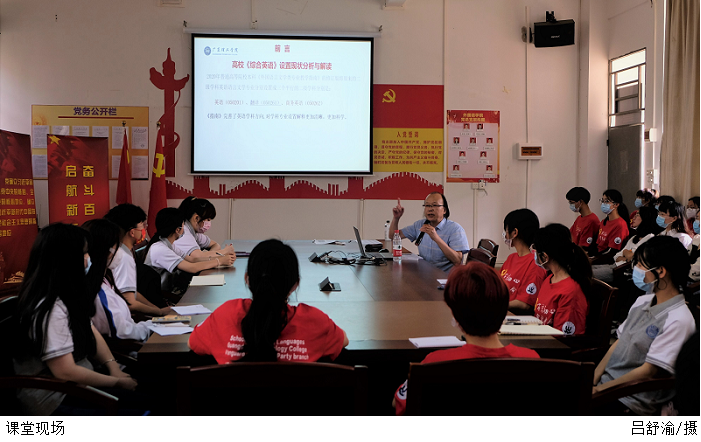 潘利锋院长结合学生专业特点,以“高校《综合英语》的设置现状分析与解读”为主题,指出该门课程的教学对人才培养的要求是“符合新时代大发展、大变革、大调整的要求,符合我国日益走近世界舞台中央、不断为人类作出更大贡献的时代的要求”。他指出,要把语言训练与人文素质培养相结合,并提出在教学实践中,要充分挖掘课程的思政元素,正确对待中西方文化与文明,做到开眼看世界的同时,也要有责任担当意识。