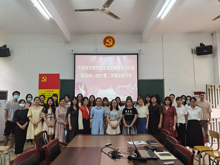 本网讯(外国语学院新闻中心)6月22日下午,外国语学院党总支在37栋101会议室召开了党史学习教育大会暨2020-2021第二学期总结大会,党总支吕丽红书记主持,全体教职工党员参会。