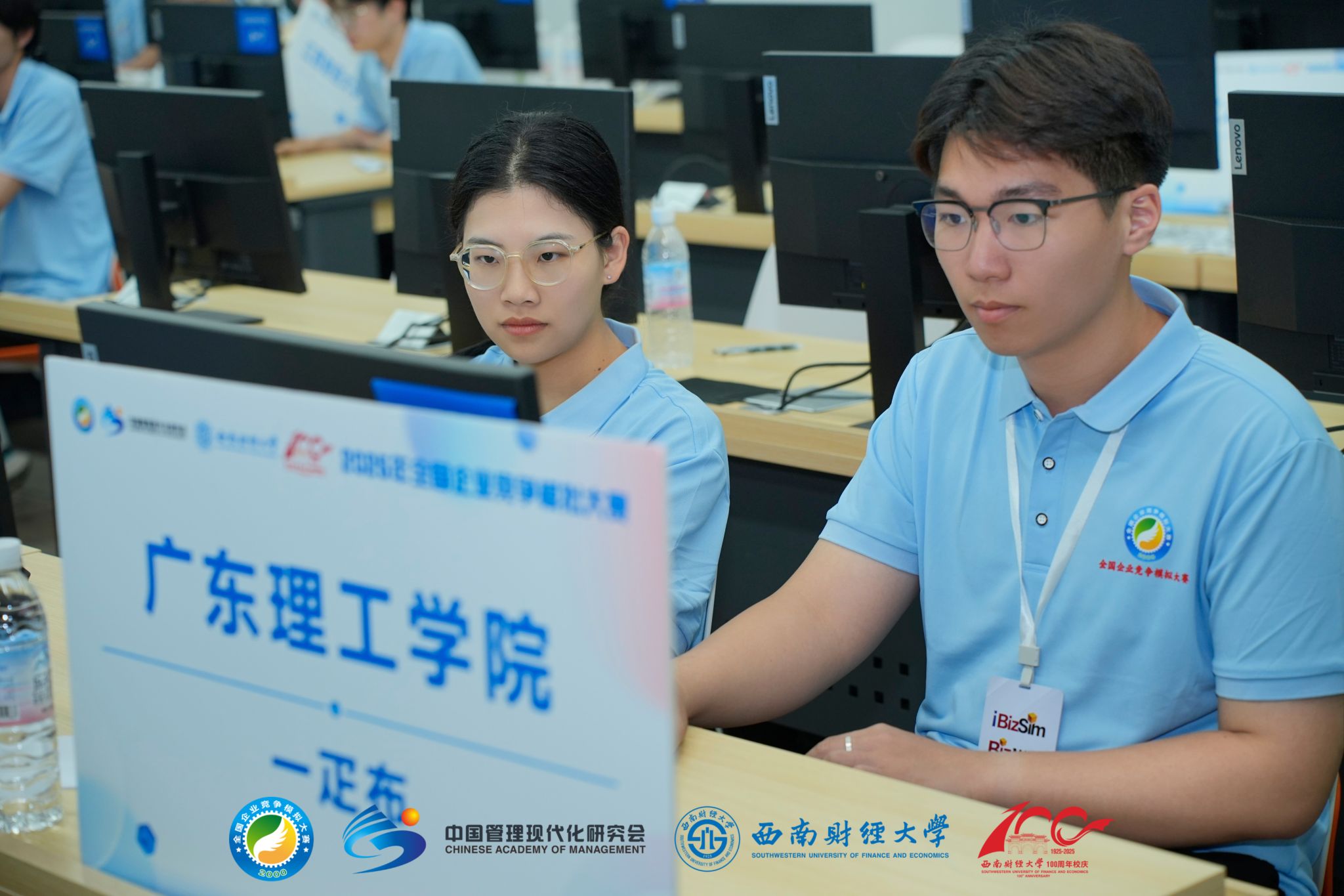 bizwar 企业运营赛道,该赛道要求参赛团队在复杂多变的市场环境下,对企业生产、运输、市场营销、财务管理、人力资源管理、研究开发以及战略发展等多方面做出精准决策。由会计学院龙凤好老师、刘国庆老师指导,队长林骏皓,队员何春雨组成的团队,凭借深厚的专业知识、敏锐的市场洞察力和默契的团队协作,一路过关斩将,最终荣获国赛一等奖。比赛期间,他们面对各种挑战,冷静分析市场动态,制定出科学合理的经营策略,展现出非凡的决策能力和应变能力。