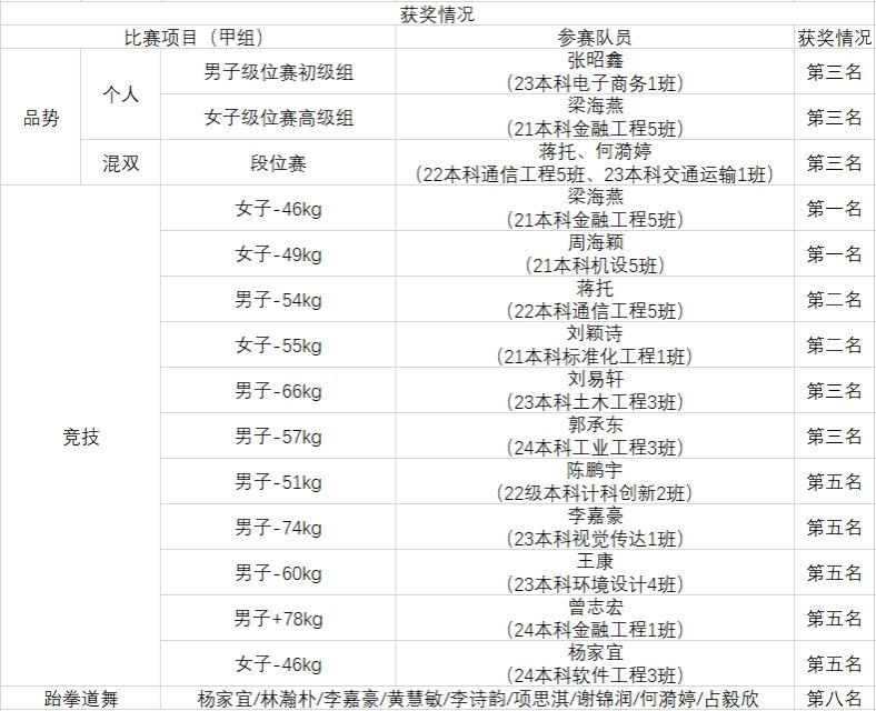 本次赛事设甲组、乙A组、乙B组和丙组四个组别,竞争异常激烈。鸭脖官网派出32名运动员参赛,在体育学院书记夏磊、副书记李江华的带领下,教练团队周尤、彭志刚、饶赛凤与队员们团结协作,迎难而上。甲组竞技团体总分位列全省第二,仅次于承办方中山大学;甲组品势团体荣获二等奖;乙A组更以6人精锐阵容斩获2金1银2铜,品势团体总分第四名,强势摘得一等奖。