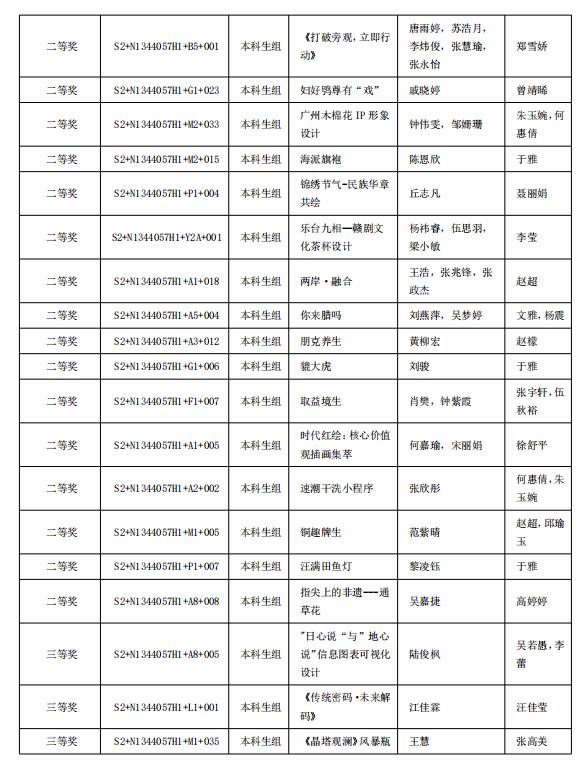 鸭脖官网本科生团队在专业老师张高美、徐舒平、高婷婷,徐莹君、何媛、何惠倩,朱玉婉、马瑞、候震、李莹、于雅、赵超、张宇轩、伍秋裕、郑雪娇、曾靖睎、聂丽娟、赵檬、文雅、杨震、吴若愚、李 蕾、汪佳莹、石晓宇、邱瑜玉老师的悉心指导下,凭借出色的创意和扎实的专业功底,脱颖而出,斩获国家级赛8项大奖。荣获一等奖2项,二等奖2项,三等奖4项,省级赛50项大奖。荣获一等奖12项,二等奖17项,三等奖21项,陈彩云 、张高美、徐舒平老师获优秀组织教师,yabo鸭脖官网凭借优异成绩获优秀组织单位。