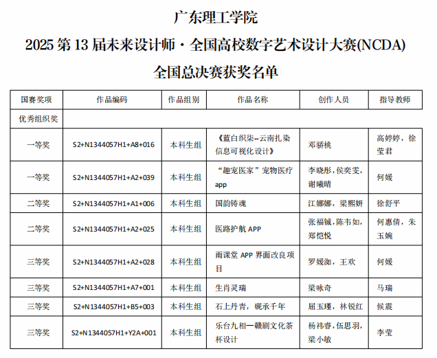 本网讯(艺术设计学院)未来设计师·全国高校数字艺术设计大赛(NCDA)是入选《全国普通高校大学生竞赛排行榜》,近20家教育厅认定,“学习强国”学习平台支持,对接联合国国际赛的全国性大学生竞赛。大赛始于2012年,每年举办一届,已连续举办12届,为艺术设计领域的高水平知名赛事,是高校积极参与的重要竞赛之一。本届大赛共有 1,893 所高校参与,征集作品 29 万余件,设有 29 个省级赛区;985 高校和一流大学的参赛率达到 95.2%,设计学学科评估 C级以上的高校全部参赛。参赛作品经过校级赛、资格赛、省级初赛、省级决赛以及全国总决赛等多轮激烈角逐,最终评选出全国赛的一、二、三等奖。