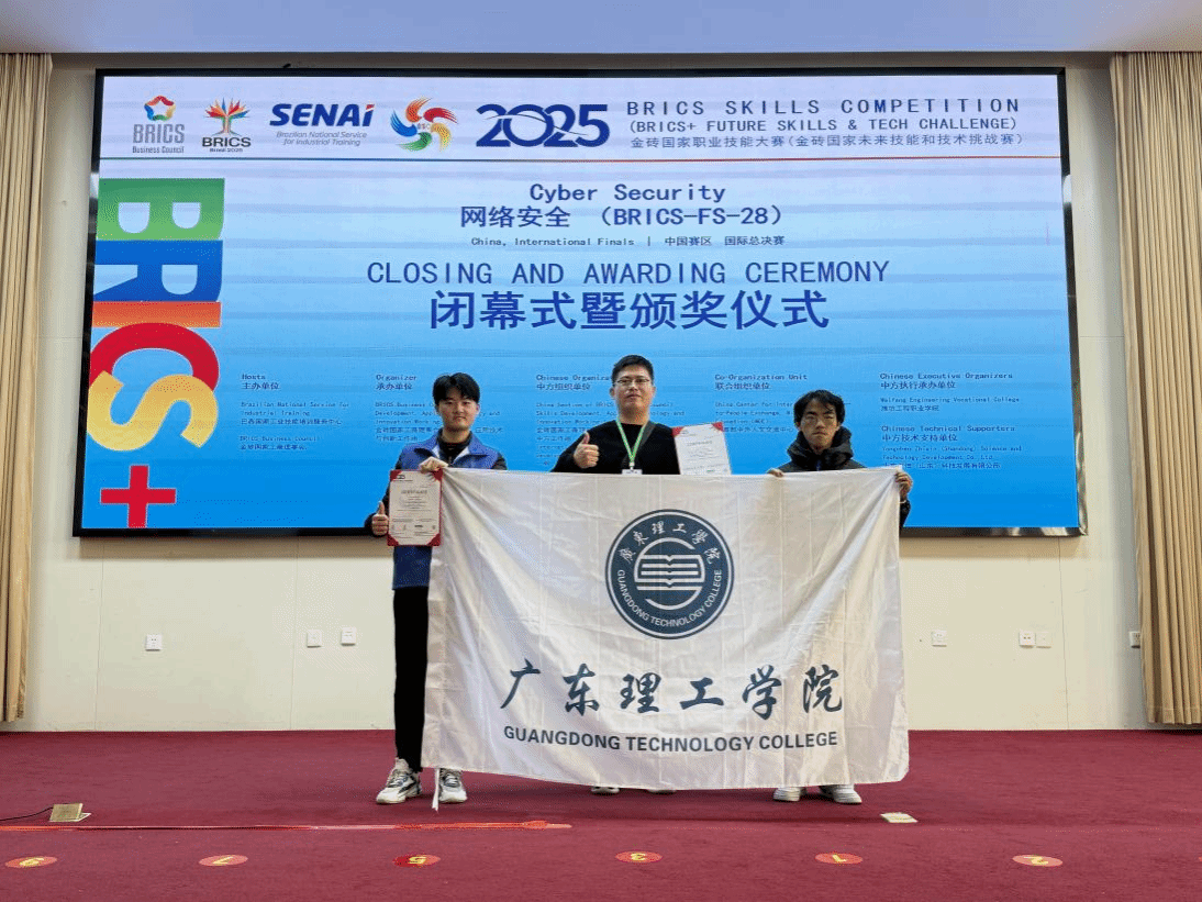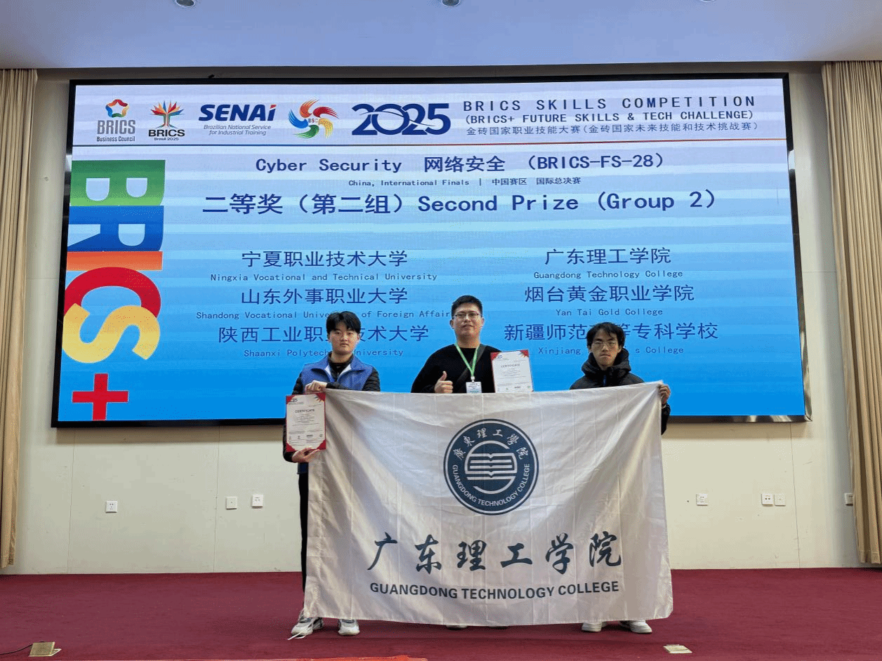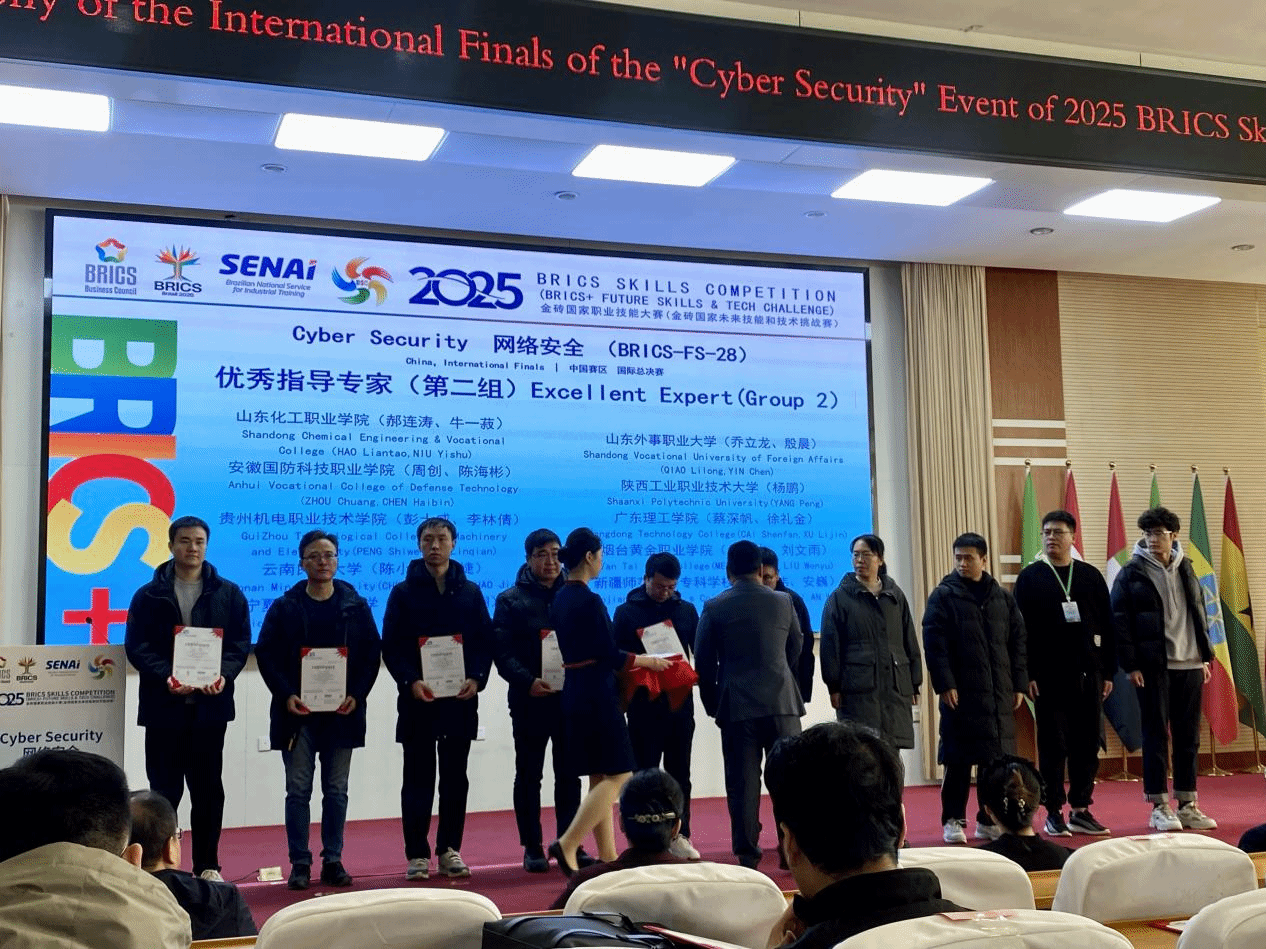 金砖国家职业技能大赛是由主办单位(巴西作为金砖国家主席国期间,由巴西方有关单位主办 2025 金砖职赛):巴西国家工业技能培训服务中心 SENAI金砖国家工商理事会主办的全国性高水平学科竞赛。本届赛事吸引了来自来自中国、南非、俄罗斯、印度、加纳5个国家的队伍经过线上线下的激烈角逐,赛事规模与影响力创历年新高。该赛事旨在聚焦高端制造、数字经济、新产业、新业态、新技术等重点领域,提升金砖+国家职业院校师生在创新、协调、组织、合作等方面的能力,丰富金砖+国家职业院校和企业交流与合作内容,培养金砖国家国际化高质量技术技能人才与人文交流人才,是国内最具权威性和影响力的学生竞赛之一。我院学子能在如此高水平、强竞争的赛事中取得佳绩,不仅是对其个人能力的肯定,更是我院在网络安全方面成果的集中体现,获奖含金量十足。