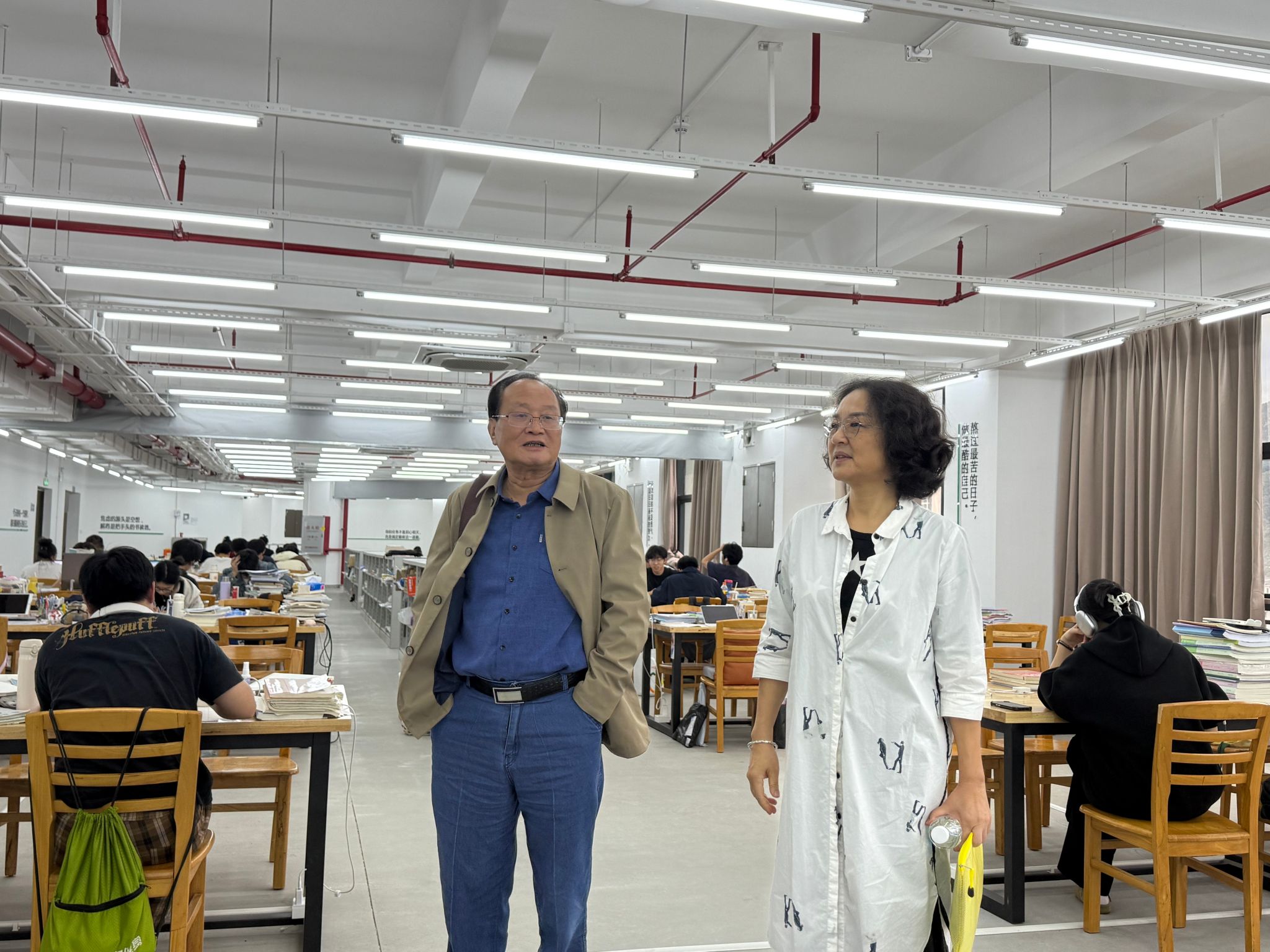 会后,陈校长一行,在经管学院赵燕院长、建设学院史会全院长等同志陪同下前往实训楼8楼,看望了正在为考研紧张复习的同学们。