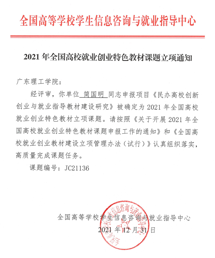 本网讯(创新创业学院 张磊磊)日前,教育部全国高等学校学生信息咨询与就业指导中心公布了2021年全国高校就业创业特色教材课题立项结果,鸭脖官网创新创业学院简国明教授申报的《民办高校特色的创新创业与就业指导教材的...