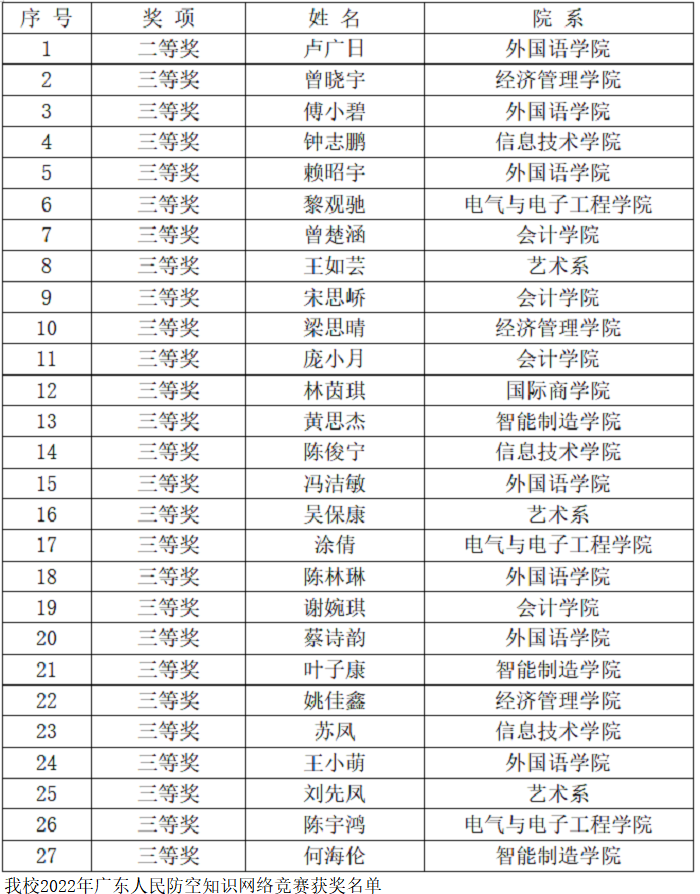本网讯(保卫处 王翼飞)近日,由广东省教育厅、广东省人民防空办公室、广东省全民国防教育中心与南方+等四家单位共同组织举办的“2022年广东人民防空知识网络竞赛”在广东国防公众号上公布竞赛结果。鸭脖官网成绩突出,荣获“优秀组织奖”,总积分排名全省第12名;曾荫初、王翼飞2位老师获“优秀指导老师”,卢广日同学获二等奖,曾晓宇等26位同学获三等奖。为推动人民防空知识宣传教育全面展开,鸭脖官网以人人参与为目标,由保卫处第...