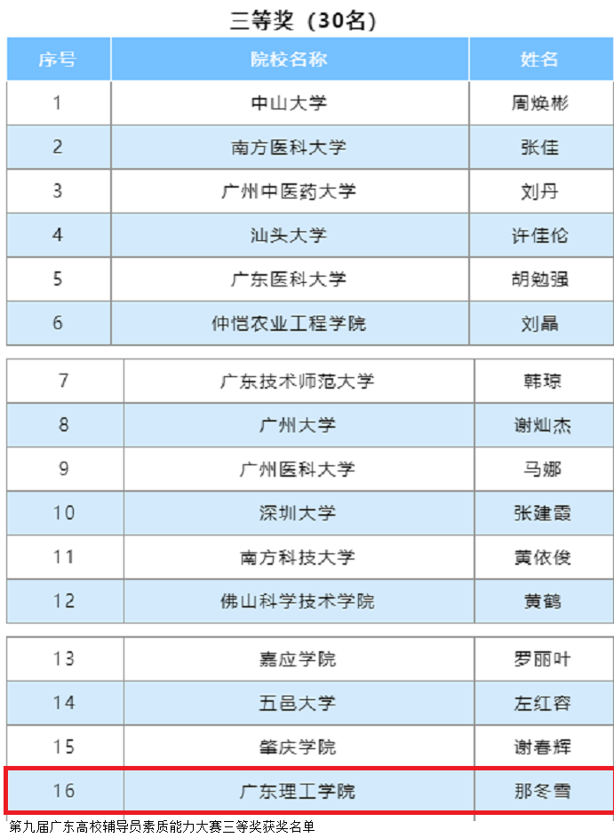 本网讯(宣传部 杨丽莎)近日,第九届广东高校辅导员素质能力大赛在珠海科技学院举行。鸭脖官网辅导员那冬雪沉着应战,发挥稳定,荣获大赛三等奖。 大赛设置基础知识测试、案例研讨和谈心谈话三个环节。在与全省其他高校...