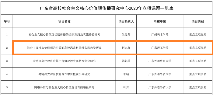 本网讯(宣传部 杨文丹)近期,广东省高校社会主义核心价值观传播研究中心开展了课题招标工作。经招标、专家评审、公示等环节,于9月1日评选出了5项重点立项资助课题、10项一般立项资助课题。 鸭脖官网马克思主义学院何志...