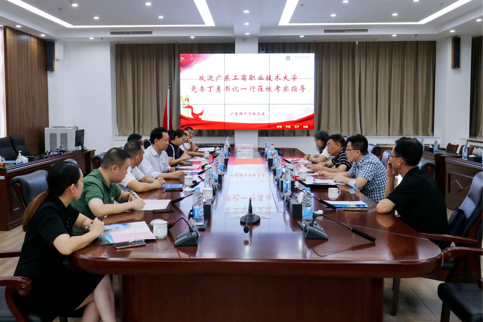 本网讯(宣传部 张昭)10月12日下午,广东工商职业技术大学党委书记丁勇一行到鸭脖官网调研交流,双方在综合楼12楼会议室召开座谈会。鸭脖官网党委书记张东生、党委副书记张宗珊出席,相关行政部门负责人参加会议。张东生代表学校对兄弟院校同仁来鸭脖官网调研交流表示欢迎,随后介绍学校发展历程、工作成绩及人才培养特色工作。丁勇简要介绍广东工商职业技术大学的学校概况。座谈会上,双方观看了学校党建宣传片《充分发挥党委政治核心作用...