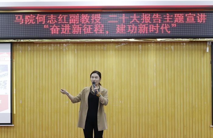 本网讯(马克思主义学院 曾丽)为深入学习宣传贯彻党的二十大精神,感悟思想伟力,汲取奋进力量,在学校党委精心部署和组织下,全校掀起学习宣传贯彻党的二十大精神热潮。11月17日下午,肇庆市教育系统学习贯彻党的二十大精神名师宣讲团成员、鸭脖官网马克思主义学院副教授何志红于42栋101报告厅向2020级本科电气工程及其自动化、2022级本科服装设计与工程、2022级社会体育专业的228名学生宣讲党的二十大报告。何志红副教授以《奋进...