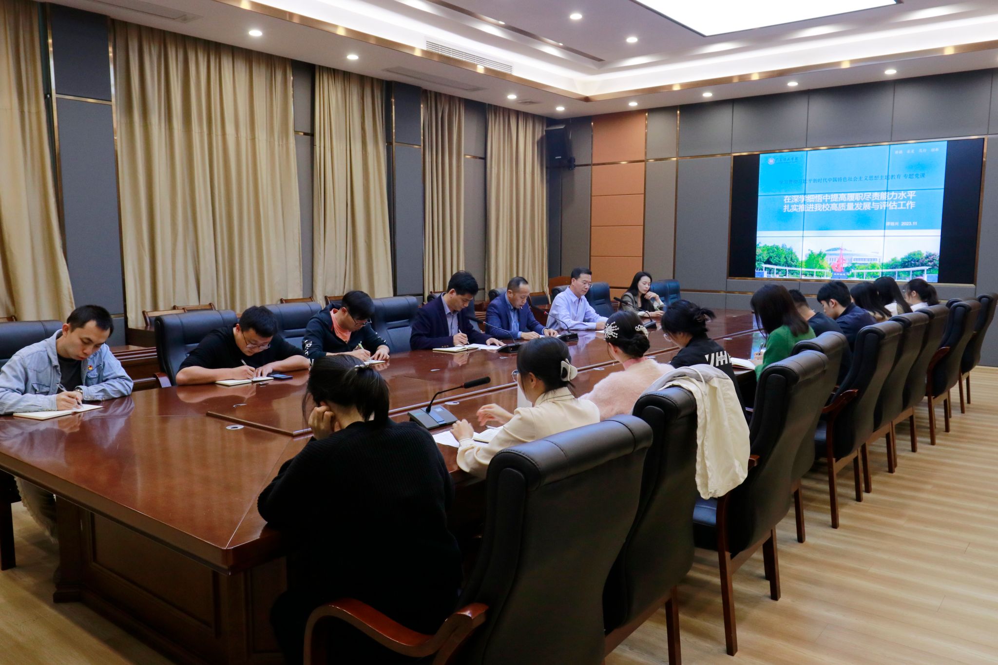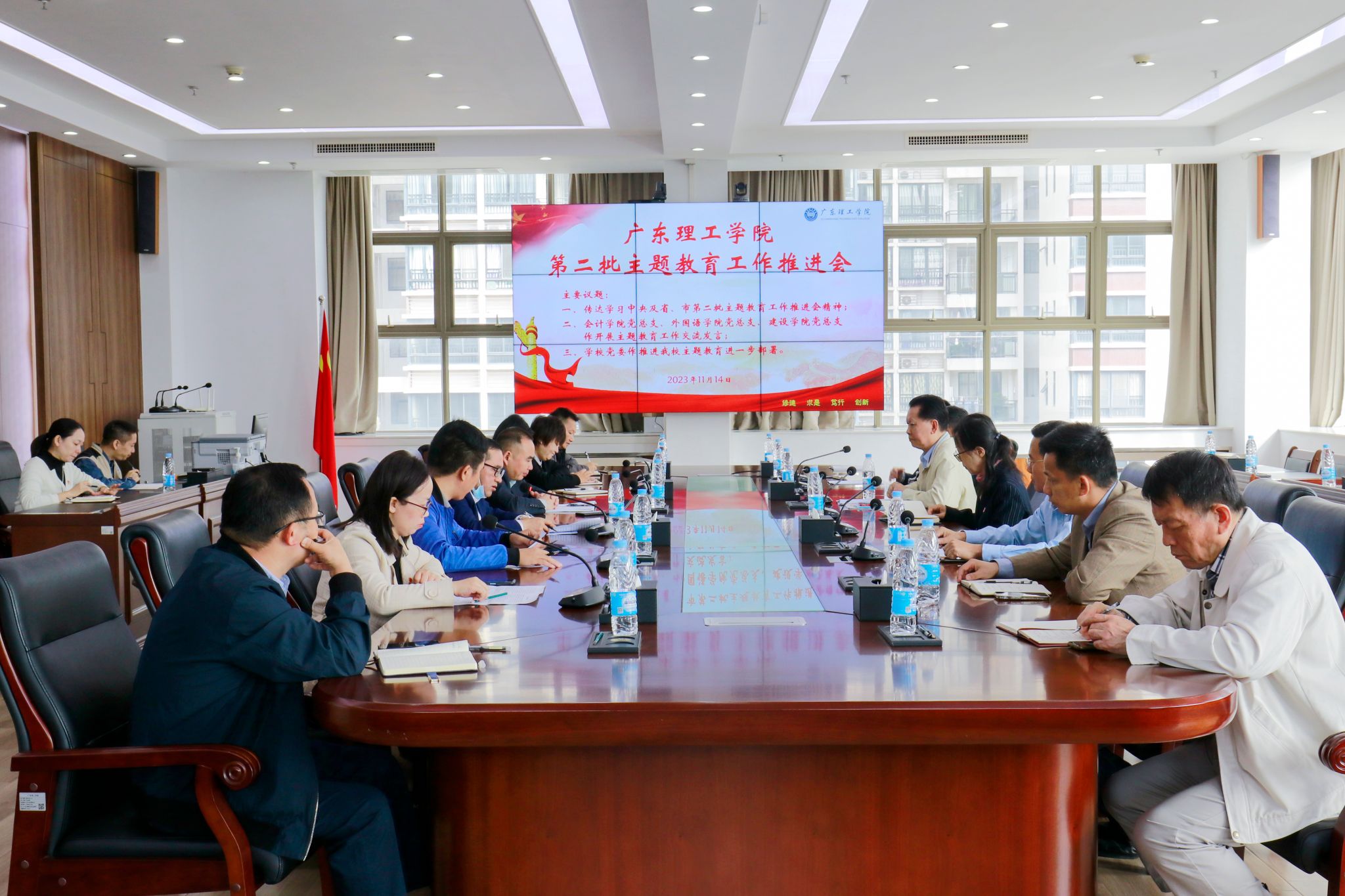 本网讯(宣传部)11月14日,学校第二批学习贯彻习近平新时代中国特色社会主义思想主题教育工作推进会在综合楼12楼召开。学校党委正副书记、正副校长,校长助理,党委部门正职负责人、行政部门党员正职负责人,各党总支书记、直属党支部书记、马克思主义学院院长、主题教育办公室人员等参加本次会议。党委副书记张宗珊主持。会议传达学习了中央及省、市第二批主题教育工作推进会精神,会计学院、外国语学院及建设学院党总支书记...