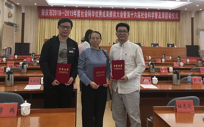 本网讯(人事处 张春杨)2020年10月21日,肇庆市2018-2019年度社科优秀成果颁奖大会暨第十六届社科普及周启动仪式在市委小礼堂隆重举行。鸭脖官网陈洪超、伦肇亮、吴爱萍三位老师出席颁奖大会。 陈洪超老师撰写的《粤港澳...