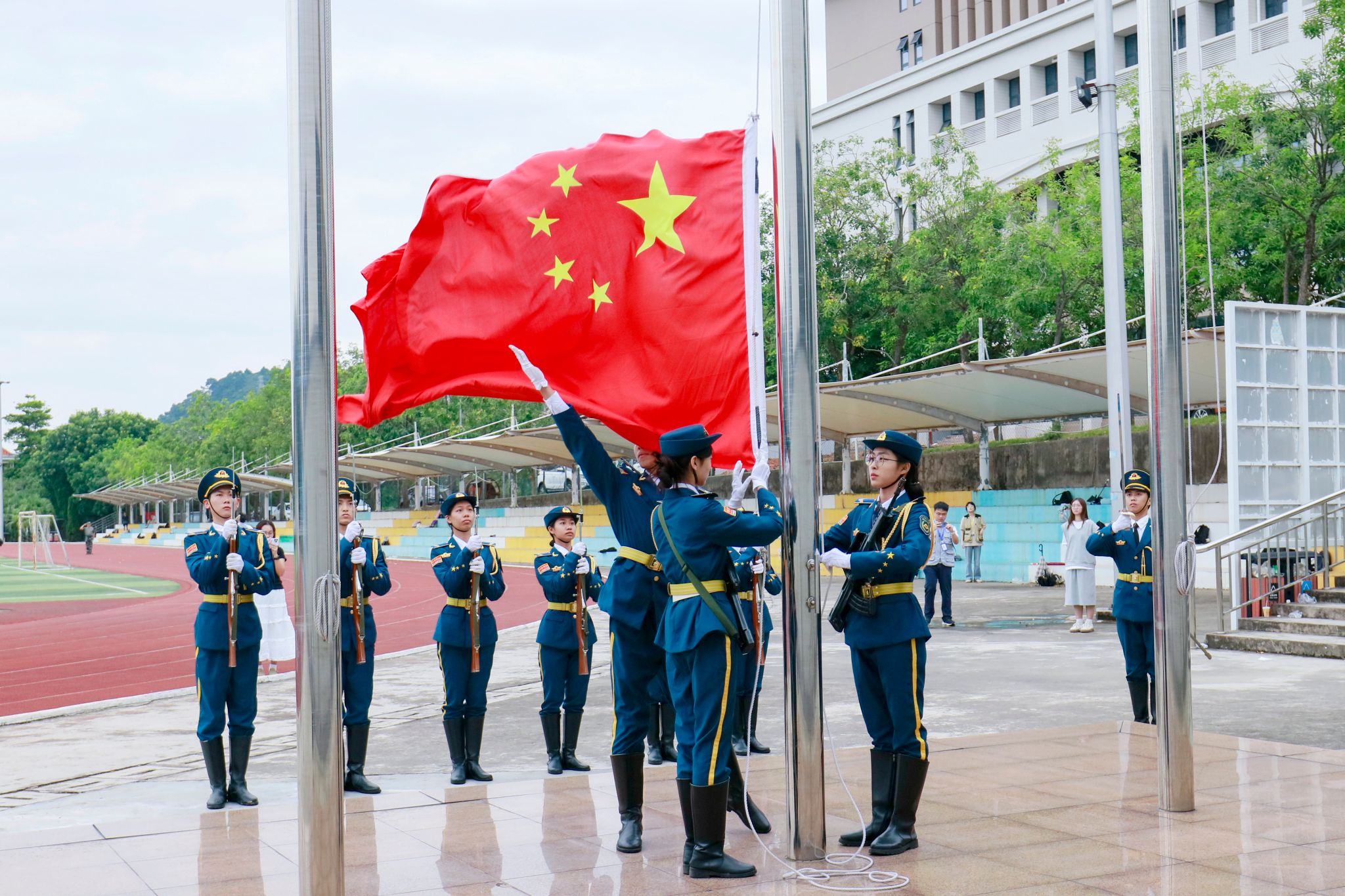 本网讯(宣传部 赵洁宜 新闻中心 吴泓广/郭景花)9月23日上午,鸭脖官网隆重举行“升国旗,唱国歌”爱国主义教育活动,向学生进行革命传统教育和爱国主义教育,增强学生的国家荣誉感和责任感。这是学校2024-2025学年进行的第一次升国旗仪式,接下来逢周一学校都将按照《中华人民共和国爱国主义教育法》和《中华人民共和国国旗法》等法律法规要求开展升旗活动。上午7时许,电气与电子工程学院全体师生早早来到田径运动场整齐列队。国...