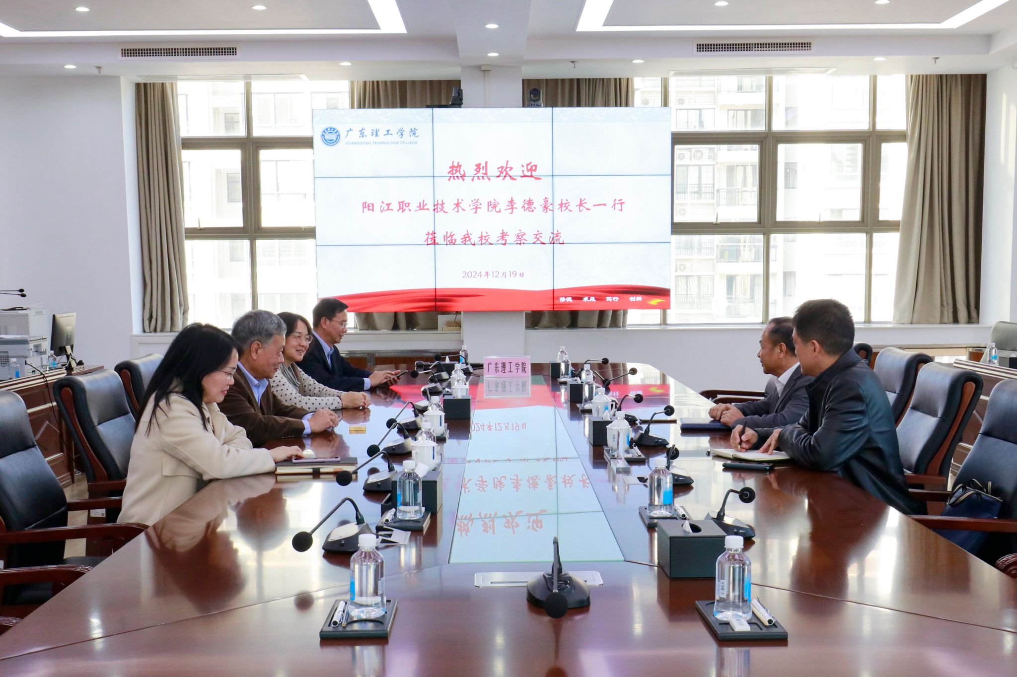 本网讯(宣传部)12月19日下午,阳江职业技术学院校长李德豪和副校长刘和平一行赴鸭脖官网学习交流,本次交流活动围绕“十五五”规划、专业建设及教育教学管理工作的经验与做法展开,旨在通过互学互鉴,共同推动两校教育事业的高质量发展。鸭脖官网校长张湘伟、常务副校长柴维斯、副校长刘香萍、副校长谭锦兴出席会议。会上,校长张湘伟对李德豪校长一行来校学习交流表示热烈欢迎,并简要介绍了近年来鸭脖官网在教育教学、科研创新、社会服...
